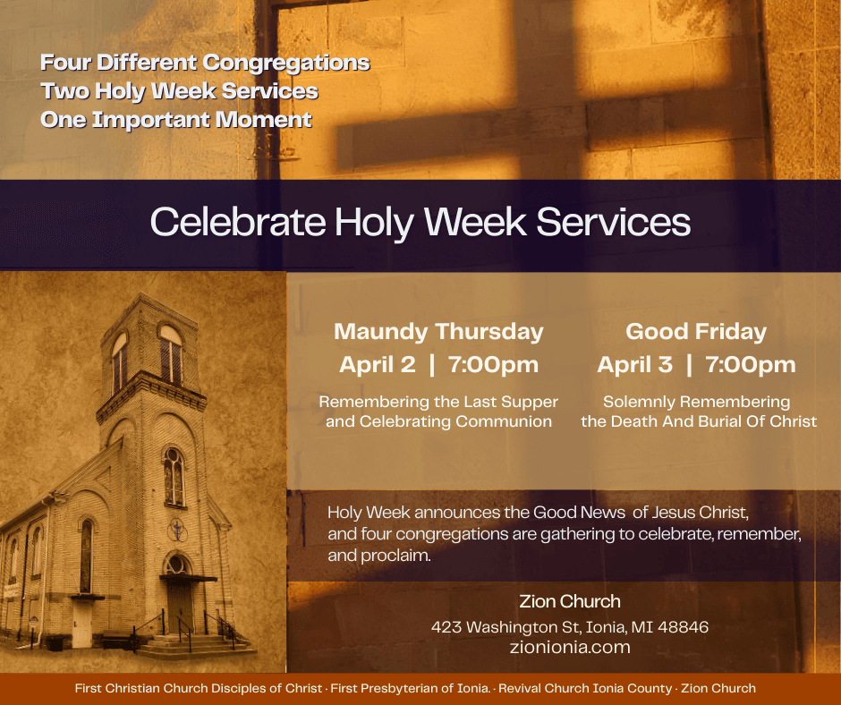 Come join us at 11 a.m. on Sunday mornings at 345 East Lincoln Ave. Ionia, MI 48846 (Parking in rear)